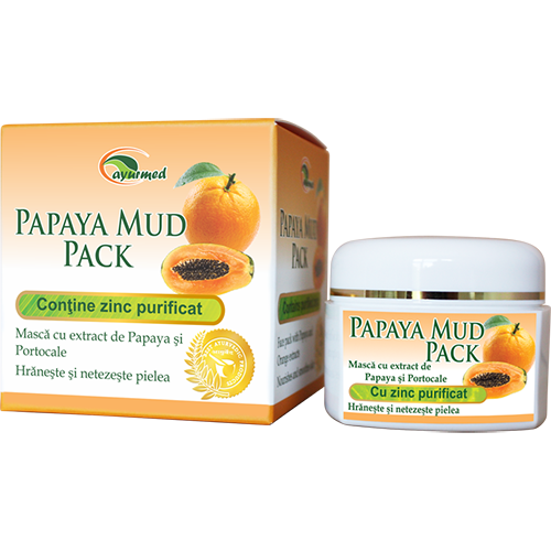 PAPAYA MUD PACK is a revitalizing mask that contains herb and fruits extracts, effective for the complete skin care with exfoliating effects, reducing wrinkles and giving the skin a youthful appearance. Orange peel extract restores and tones the skin and is strong anti-inflammatory, making it smoother and silky. Eliminates toxins, rashes, blackheads and excess of fluid from the tissues. Orange peel extracts regenerates cells, whitens and removes the skin pigmentation spots. Vitamin C in the orange peel extract supports the integrity and restores collagen and elastin in the skin maintaining its elasticity and tone, giving it a healthy look. Papaya contains papain enzyme, which is an effective natural exfoliator removing dead cells and pigmentation spots from the skin surface. The rich content of minerals and vitamins, especially vitamin C, confer to the papaya fruit the property of rendering firmness and elasticity to the skin by producing more collagen and elastin, thus reducing the wrinkles.